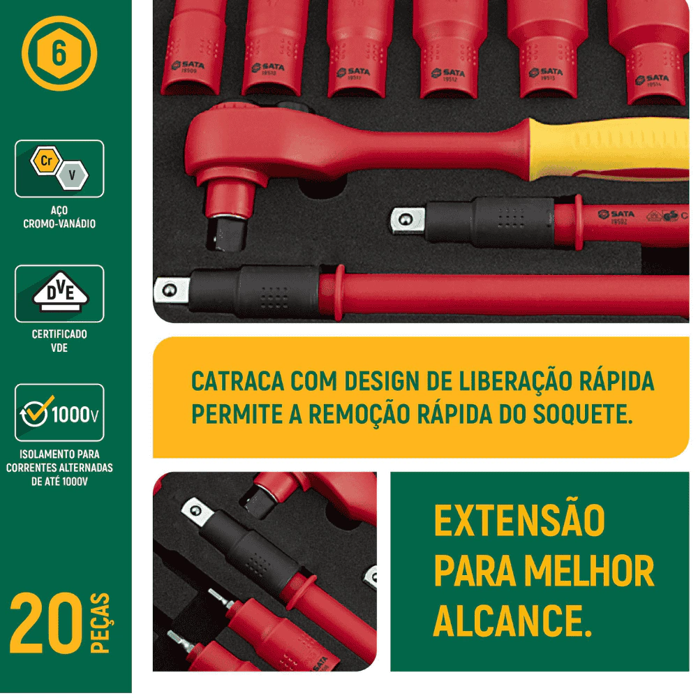 Jogo de Chave Catraca Isolado VDE com 20 Peças para Trabalhos Elétricos ST09267 – SATA